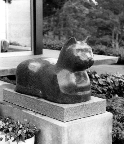 The Cat (we never called it anything else) was sculpted first in oil clay, the form transferred via huge calipers to terra cotta, cast in plaster, and the final form in true scale transferred to the stone. Black granite is extremely hard, and cannot be chiseled like marble or other softer stone. A nine-point crushing chisel, powered by compressed air, is used to rough in the sculpture. Then the surface is polished manually in many stages of polishing stones, and finally buffed to a high sheen. It's a long and tedious process. My good friend Tip McPartland and I worked for Arch doing many hours of smoothing and polishing. The project was done in the back yard of Doc's Lab on Cannery Row. |