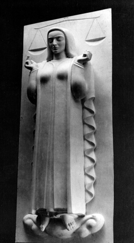 Other public works include "Law," a sandstone figure in the LA Federal Building (1940-41); "Centinella Springs" a wood bas-relief in the Inglewood, CA, Post Office (1937); "Justice," poured stone relief, exterior, Fresno, CA, Post Office (1939-40);"Transportation of the Mail," nine Terra Cotta relief panels, exterior, San Diego, CA, Post Office (1938-39); "Saint Barbara" poured stone and metal figure (commission unknown and now lost)(1939). During this time he also executed numerous small pieces, for the movie sets and for private commissions, as well as teaching sculpture at Occidental College. | ![]() Justice (1939-40) |